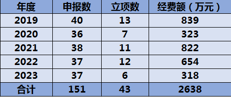 2019-2023年,学院申报国家自然科学基金151项,获批43项,资助率28.48%,经费额共计2638万元。其中获得国家自然基金联合基金重点支持项目2项。