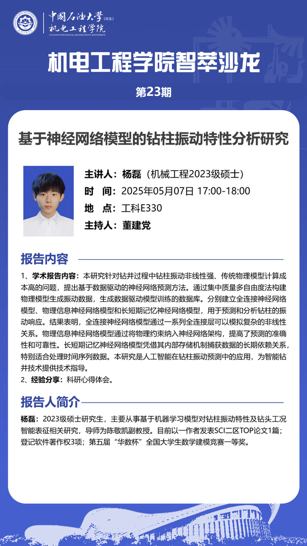 【智萃沙龙(第23期)】基于神经网络模型的钻柱振动特性分析研究(机械工程2023级硕士 杨磊主讲)