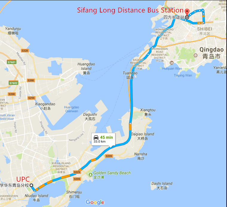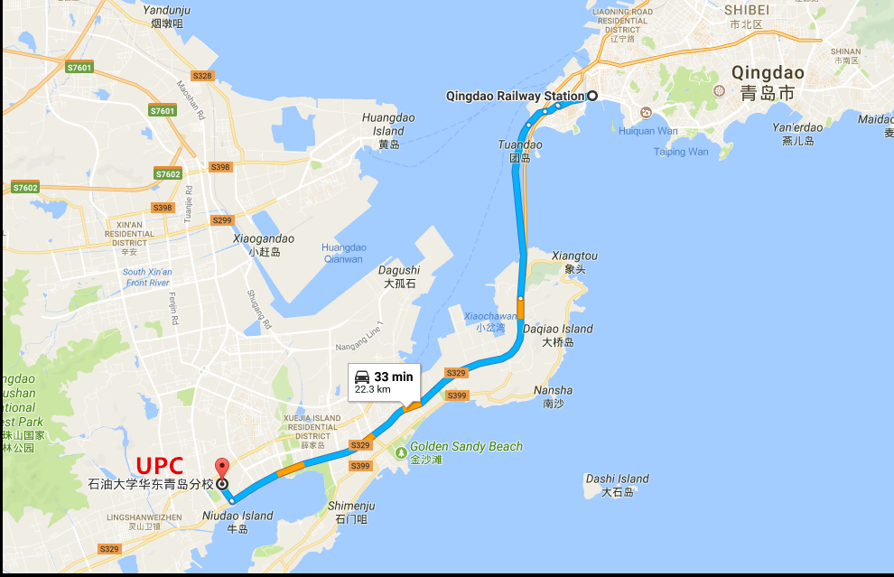 青岛火车站位于青岛市中心西南方。学生可乘坐隧道5、6、7路车从火车站到达爱游戏app官方入口 南门,站名为“石油大学”。车程约40分钟。