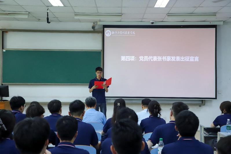 出征仪式由黄书涛主持,仪式伊始,由党员代表徐泰领誓,全体毕业生党员重温入党誓词。