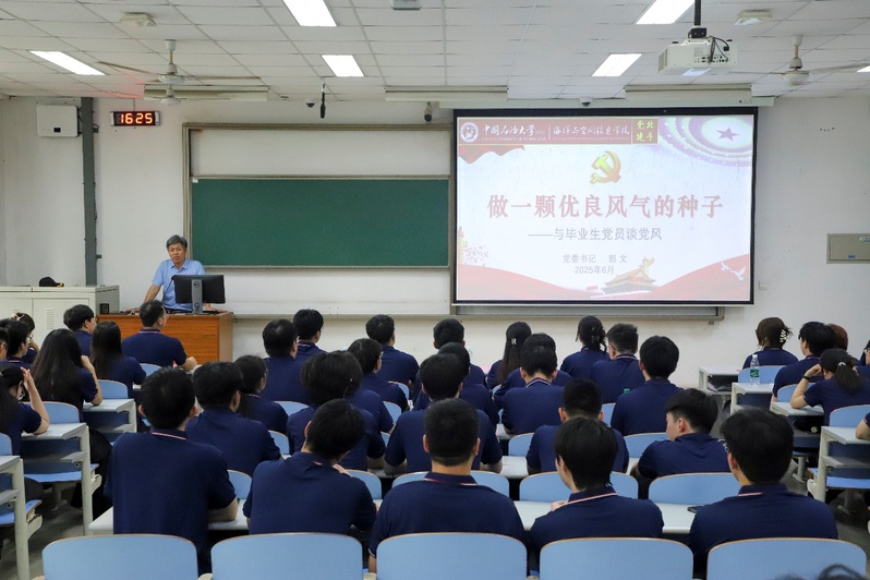 为深入贯彻落实习近平新时代中国特色社会主义思想,落实立德树人根本任务,教育引导广大毕业生党员不忘初心、牢记使命,坚定理想信念,进一步筑牢廉洁从业思想防线,海洋与空间信息学院于6月18日下午在南教107举办海空学院2025届本科毕业生党员出征仪式暨廉洁从业教育,学院党委书记郭文、学院党委副书记于华帅、合作发展处宋臻、2021级本科生辅导员及全体毕业本科生党员参与此次活动。