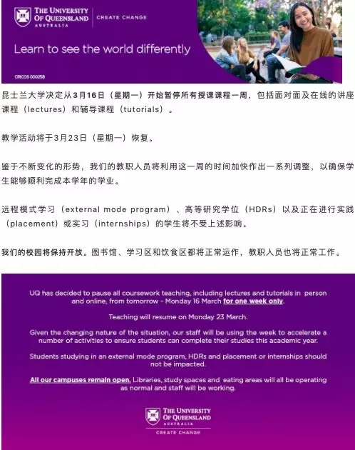 学校于3月13日起暂停所有课程,暂定3月23日起远程教学直至另行通知。