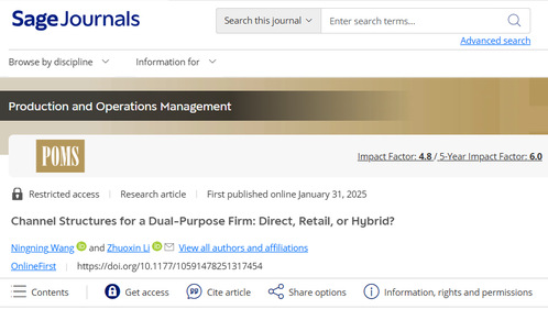 近日,我院特任教授王宁宁与威斯康星大学麦迪逊分校Zhuoxin Li教授合作的论文“Channel Structures for a Dual-Purpose Firm: Direct, Retail, or Hybrid?”(《双重目标企业的渠道结构:直销,零售,还是混合?》)在线发表于管理学顶级期刊Production and Operations Management。王宁宁为第一作者,爱游戏app官方入口 (华东)为第一署名单位。该研究得到国家自然科学基金资助。