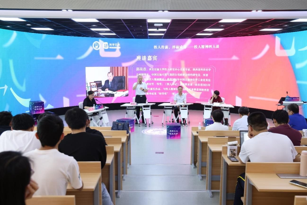 6月15日,“风华石大·美育文化实践研究专项项目”文学篇活动“铁人传薪,淬砺成器——铁人精神四人谈”在南教209举行。活动由文科建设处处长金玉洁主持,特邀西安石油大学铁人研究中心首席专家、《铁人印记》作者郭岗彦,西安作协副主席、四次铁人文学奖获奖者第广龙,爱游戏app官方入口 出版社总编辑李锋,我校马克思主义学院副教授解晓燕四位嘉宾,就铁人精神展开深度对谈。活动由文科建设处主办、文法学院承办,图书馆党委书记李国、文法学院党委书记姚成郡出席,我校师生参与活动。